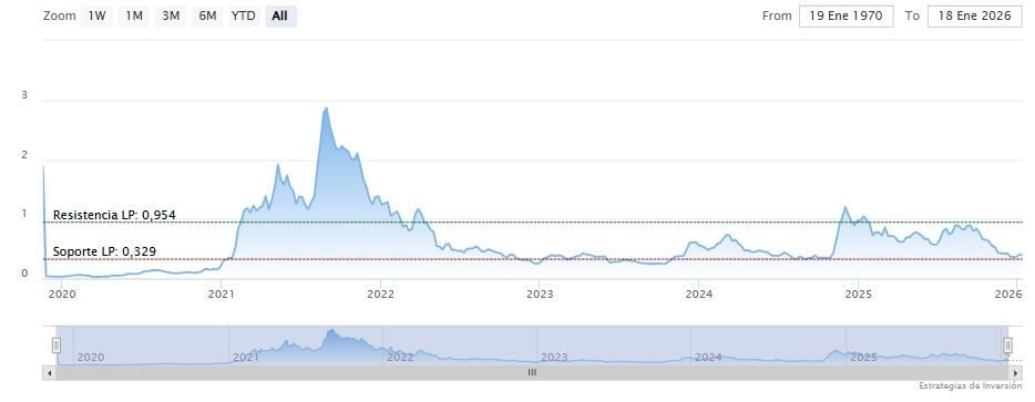El soporte a mediano y largo plazo se encuentra en los 0.329 dólares. Mientras, los indicadores de Ei se muestran mixtos.