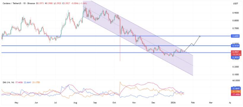 Cardano continúa operando dentro de un canal descendente de varios meses, cerca del límite inferior entre 0.38 y 0.39 dólares. El precio ha probado esta zona repetidamente y, hasta el momento, se ha negado a alcanzar mínimos más bajos. Este es un cambio sutil pero importante. Los vendedores parecen menos agresivos, incluso si los compradores no han tomado el control.
