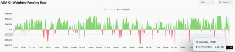Los datos de financiación respaldan esta perspectiva. La tasa de financiación ponderada por OI se ha vuelto ligeramente positiva, en torno al +0.0018 %, recuperándose de un período prolongado por debajo de cero. Esto sugiere que la presión a corto plazo ha disminuido significativamente. Los operadores ya no cobran por mantener posiciones bajistas.
