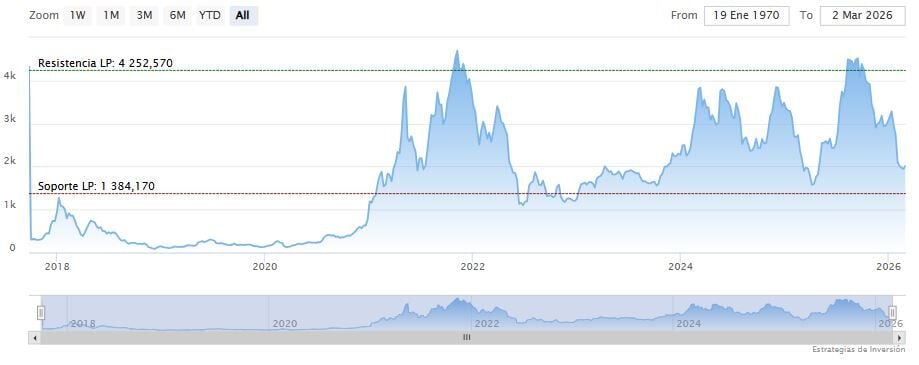 Ethereum abre el miércoles a la baja en los 1.982 dólares. La media móvil de 70 periodos se mantiene debajo de las últimas velas, RSI plano en los 43 puntos y las líneas del MACD debajo del nivel de cero.