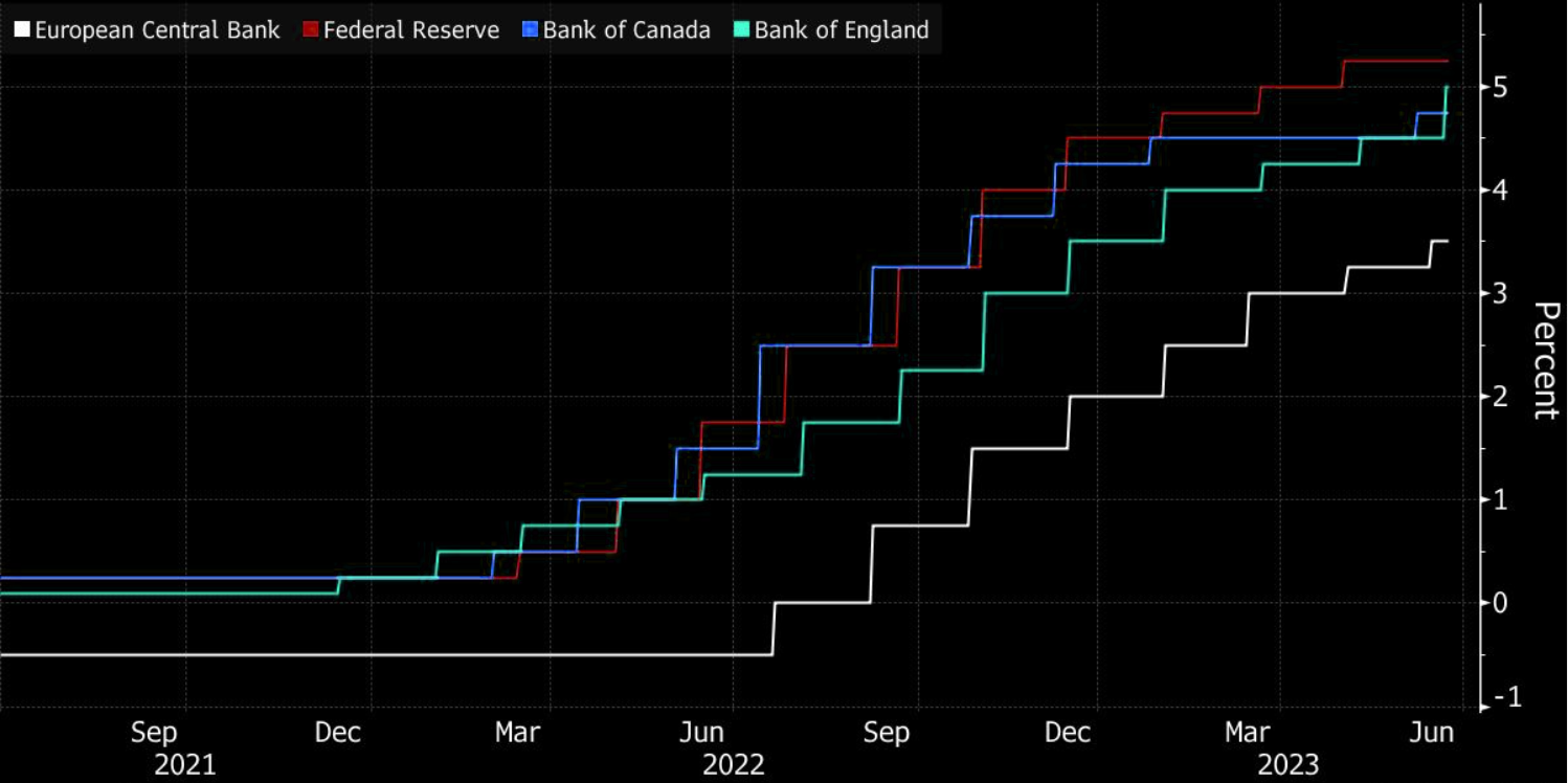Vean cómo se han comportado los tipos de interés de las principales economía. La Fed fue el primero en "desenfundar" y el resto le han seguido. Europa es la más rezagada (color blanco), pero no parece que vaya a parar de momento, a pesar de que en EEUU ( color rojo) ya se empiezan a ver los estragos de estos tipos de interés.