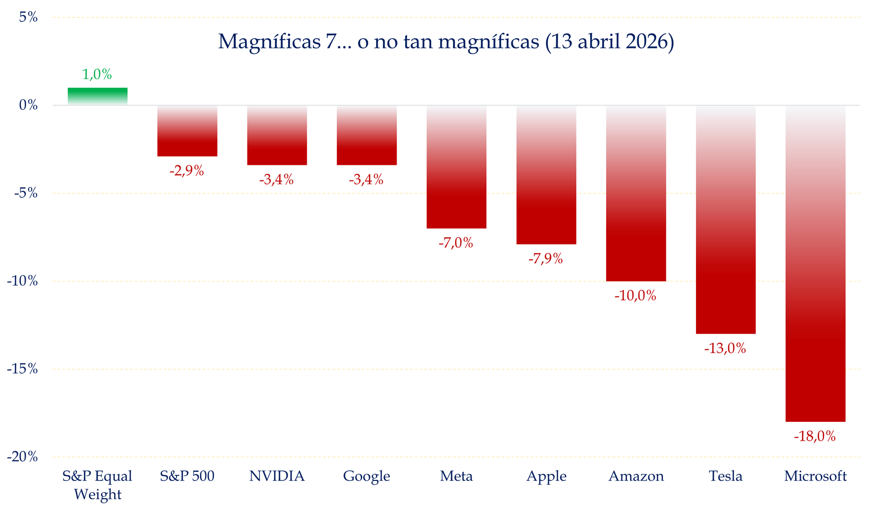 En el gráfico se ve que, mientras el S&P 500 Equal Weight se mantiene ligeramente en positivo (+1%), varias de las grandes estrellas del mercado empiezan a mostrar correcciones relevantes.