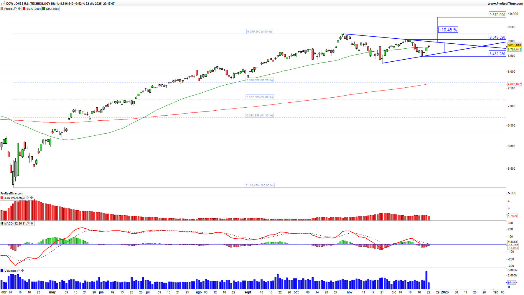 Dow Jones U.STechnology (DJUSTC) en escala diaria con volatilidad (gráfico central superior), MACD (gráfico central inferior) y actividad de contratación (ventana inferior). Fuente: ProRealTime y elaboración propia.
