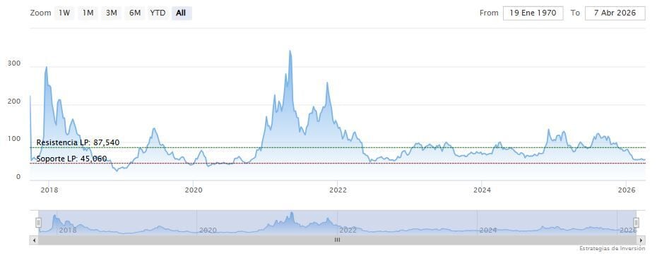 Litecoin cotiza en rojo al mediodía del miércoles en los 55.16 dólares. La media móvil de 70 periodos se encuentra debajo de la última vela, RSI a la baja en los 52 puntos y las líneas del MACD debajo del nivel de cero.