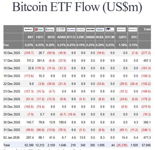 Según Farside, el 2 de enero se registraron entradas netas por 471.3 millones de dólares. De los mismos, 187.4 millones de dólares se concentraron en el fondo IBIT de BlackRock, mientras que el ETF FBTC de Fidelity captó 88.1 millones de dólares.