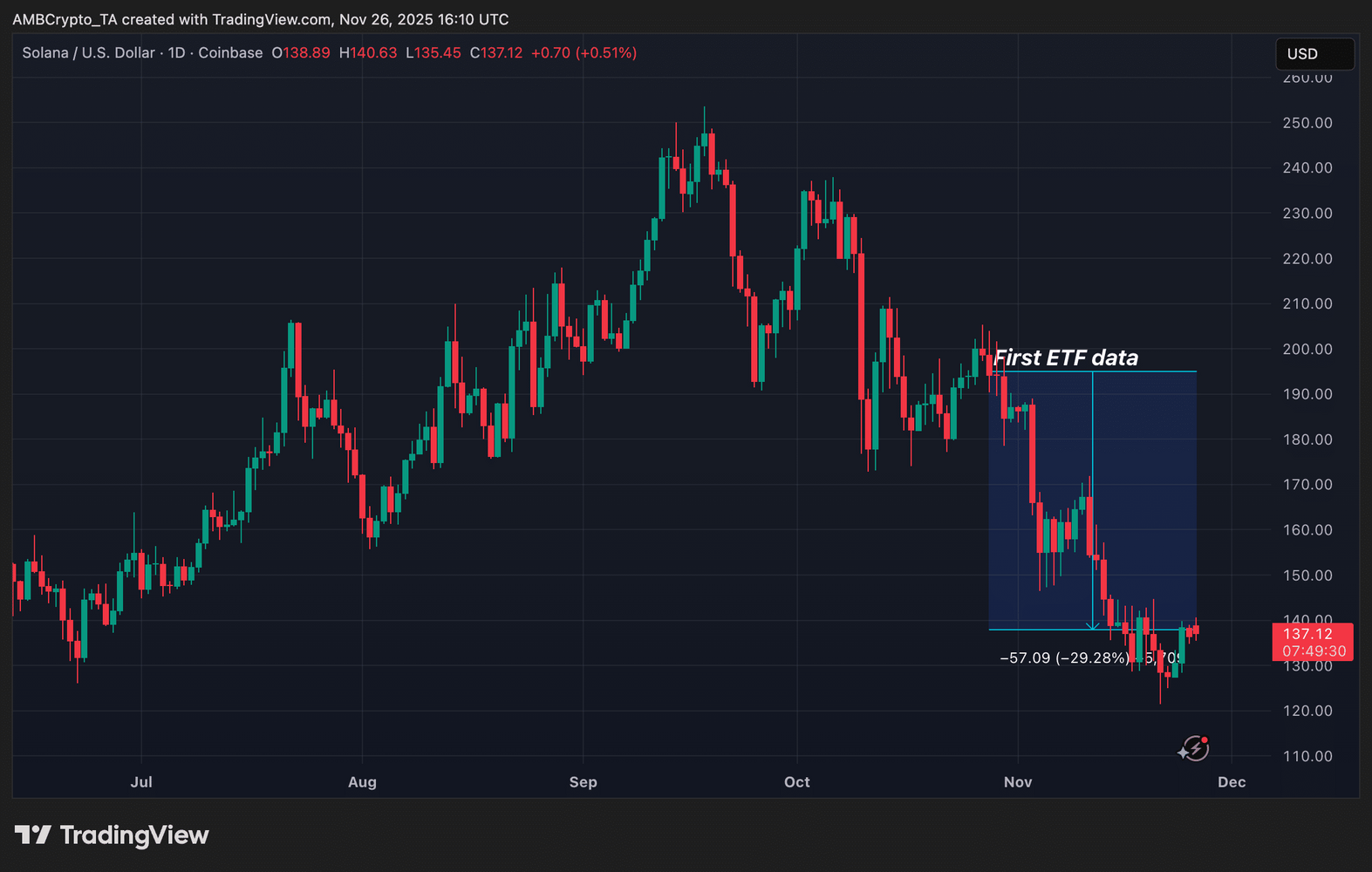 El gráfico de precios muestra que, desde finales de octubre hasta finales de noviembre, Solana experimentó una presión bajista constante.