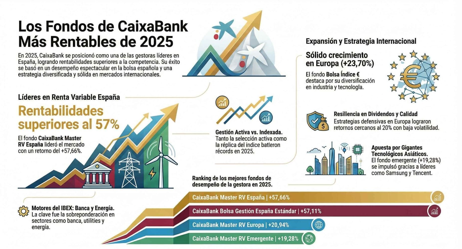 Los fondos de CaixaBank en 2025 han sido los vencedores, como decía al principio, junto con Bestinver. Han destacado en gestión activa y pasiva, en España, Europa y emergentes.