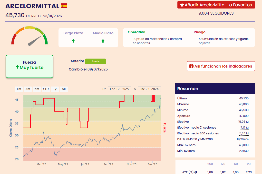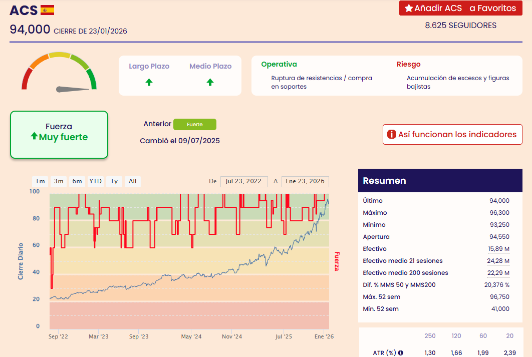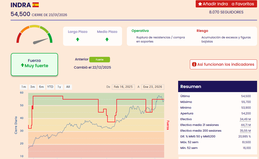 Podemos ver que el Indicador de fuerza y tendencia dio señal de fuerza el pasado 21 de Enero del 2025, y en este año el valor ha pasado de cotizar a 24 euros a casi doblar en poco más de un año.