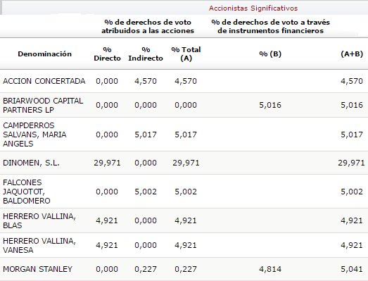 Por debajo, con un 5,002% de la compañía está Baldomero Falcones, ex presidente de FCC, y rozando el 5% está la familia de empresarios audiovisuales asturianos Herrero Vallina (4,921% de forma indirecta).