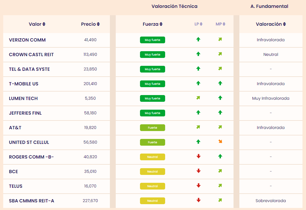 En el sector de Telecomunicaciones, 8 valores están muy fuertes o fuertes y 4 están en situación neutral, tal y cómo podemos ver en el siguiente cuadro.