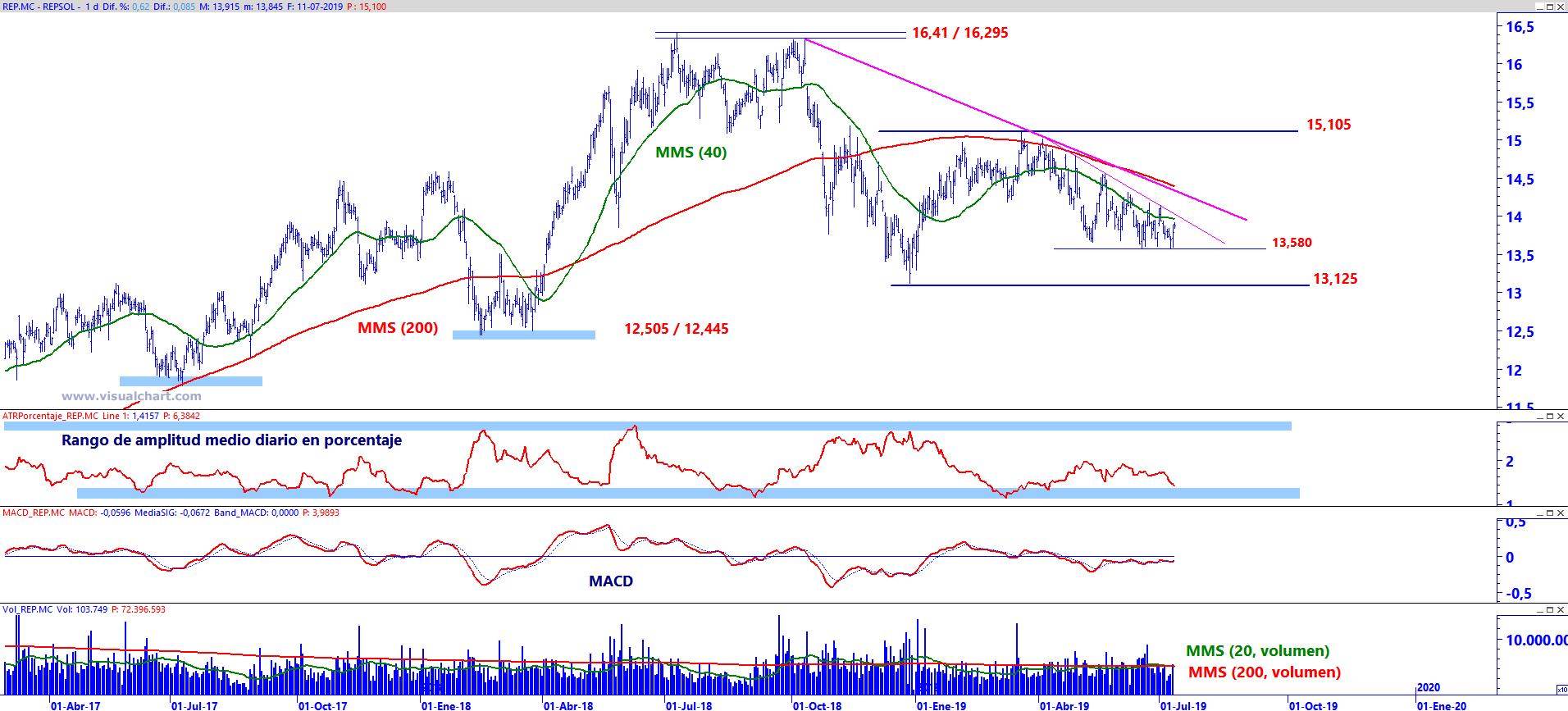 Repsol en gráfico diario con Rango de amplitud medio en porcentaje, oscilador MACD y volumen de contratación