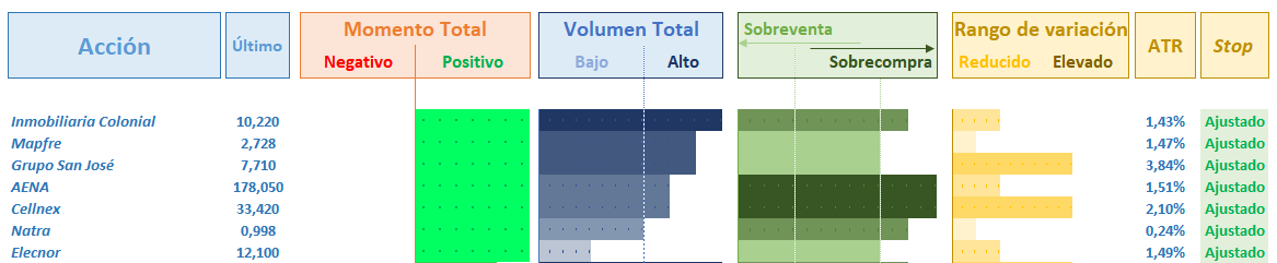 Este primer filtro, nos permite seleccionar los valores con menor fortaleza en el corto plazo en el mercado español. En segundo lugar, extraemos estos valores líderes para compararlos entre dos variables, (1) rentabilidad media y (2) volatilidad, por lo que nos quedaremos con los valores que presenten menor rentabilidad media que el resto así como una mayor volatilidad, medida a través del ATR. Finalmente, analizamos los valores seleccionados en el segundo filtro a través de un análisis de precios, con la plantilla de análisis de la herramienta de corto plazo desarrollada por el Departamento de Análisis de Estrategias de Inversión, para analizar su situación y objetivos.