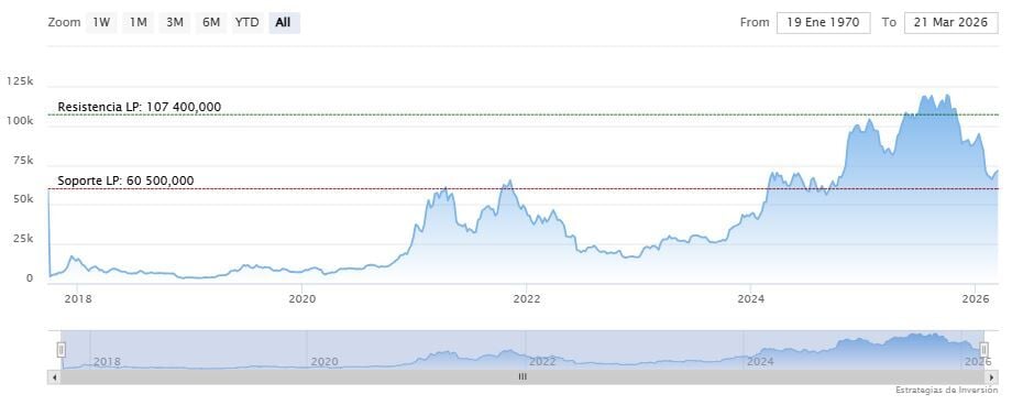 El soporte a mediano y largo plazo se mantiene en los 60.500 dólares. Mientras, los indicadores de Ei se muestran mixtos.