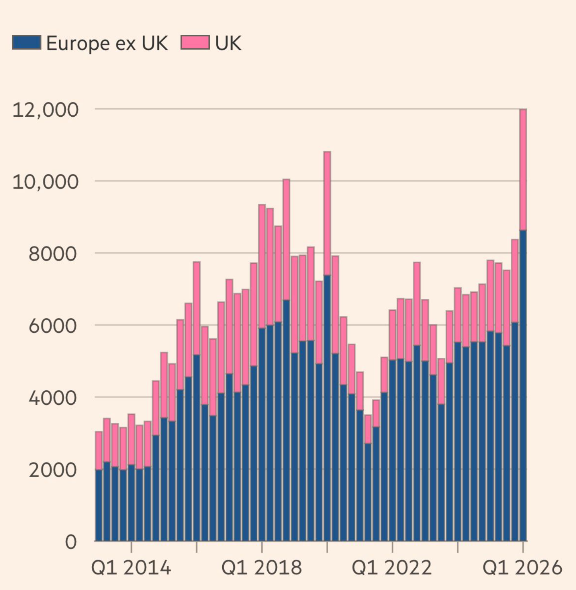 El primero de ellos... vean este gráfico del diario FT sobre las posiciones cortas en valores europeos y de Reino Unido. Están en máximos, lo que significa que el mercado ha subido mucho y los gestores empiezan a ver que el recorrido que le queda a los valores ya no es tan grande.