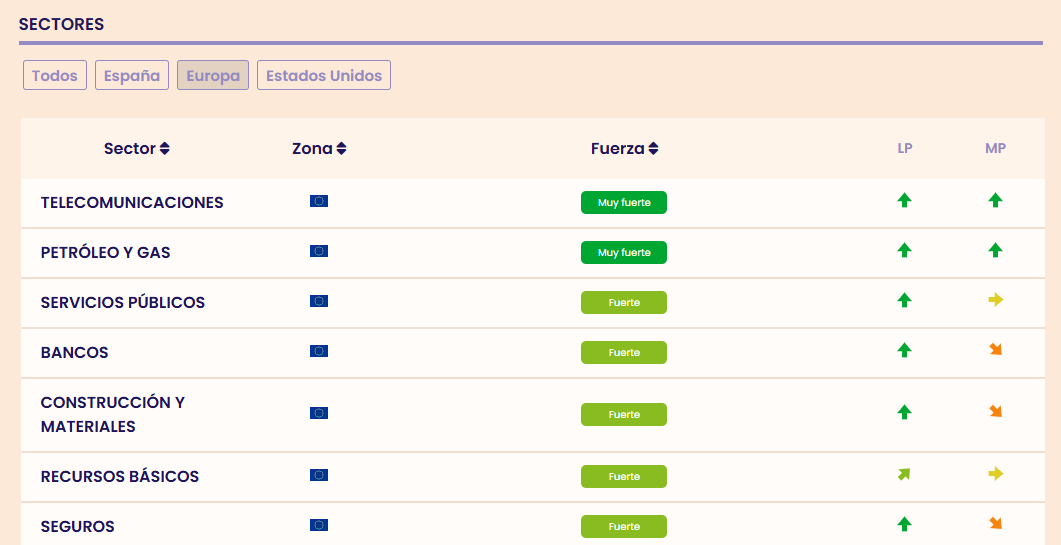 De momento, según nuestros indicadores premium de fuerza sectorial, los sectores europeos de Telecomunicaciones y de Petróleo y Gas están muy fuertes, mientras que Servicios Públicos, Bancos, Construcción, Recursos Básicos y Seguros, siguen fuertes.