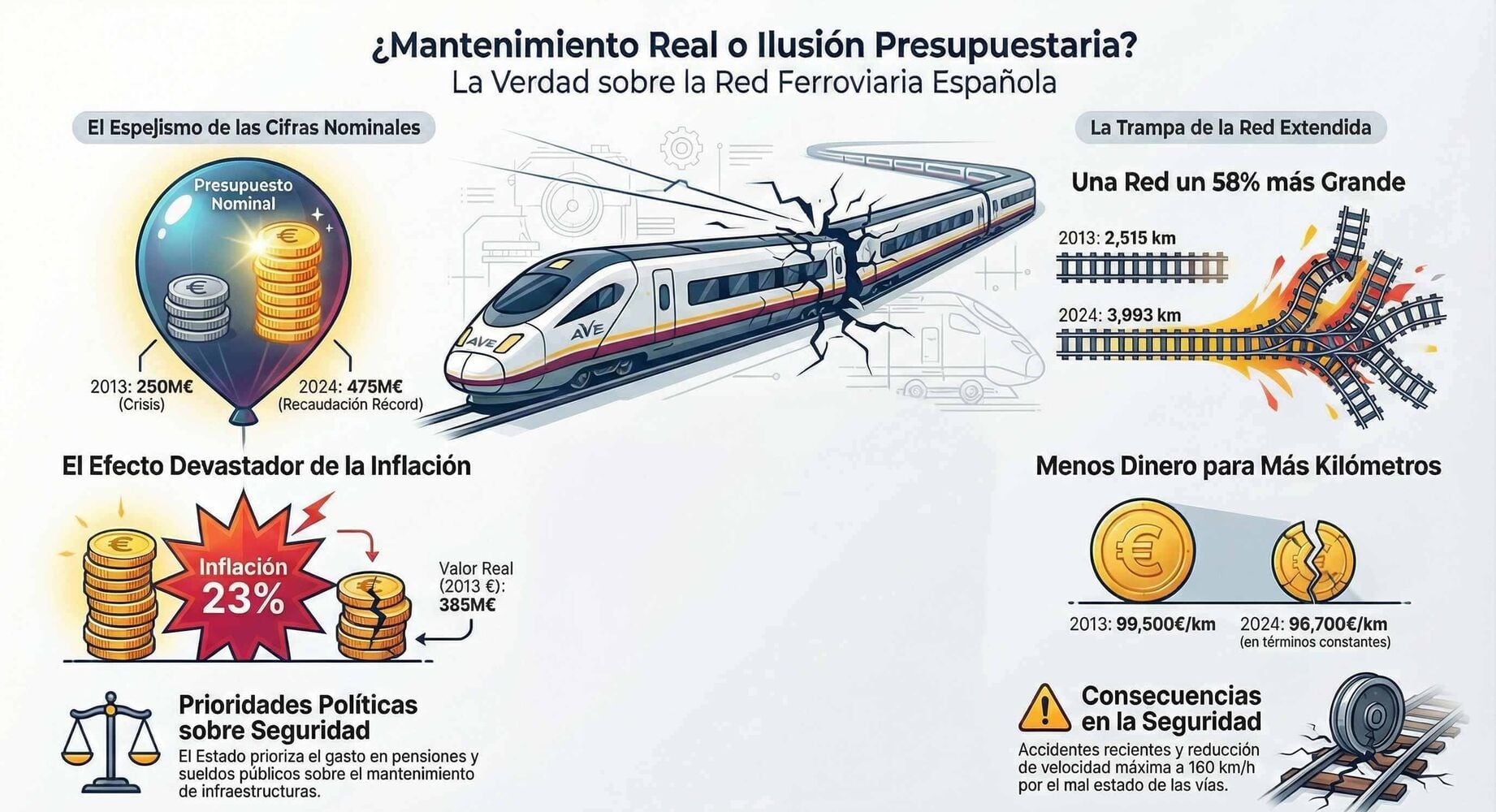 La combinación de red envejecida, mantenimiento insuficiente y recaudación récord es una bomba de relojería. No se trata solo de eficiencia económica, sino de responsabilidad institucional. En términos de coste de oportunidad, cada euro no invertido en mantener infraestructuras es un riesgo que asumimos como sociedad. Y no solo por la seguridad, que es lo prioritario, sino por la cantidad de contratos que estamos viendo paralizados de nuestras empresas en el extranjero, que no tienen culpa alguna en que se haya disminuido el gasto de mantenimiento de la vía.