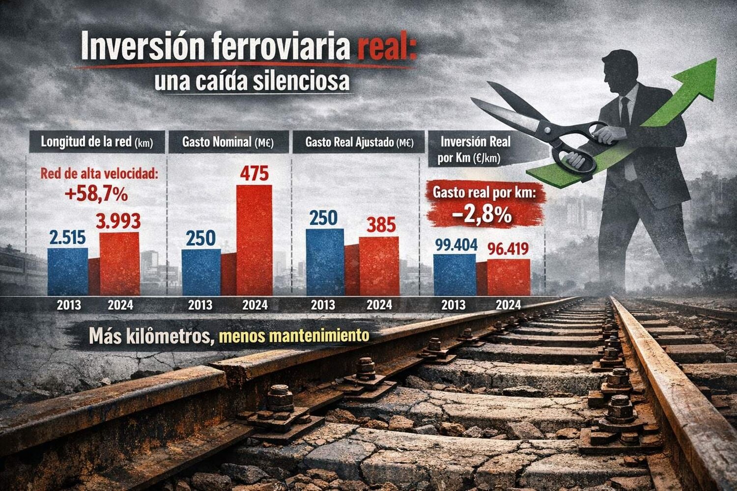 Así las cosas, el cálculo es sencillo. En 2013, la inversión real por kilómetro de vía era de 99.403,58 euros, y la de 2024 de 96.418,73 euros. Es decir, una caída del 2,81%.