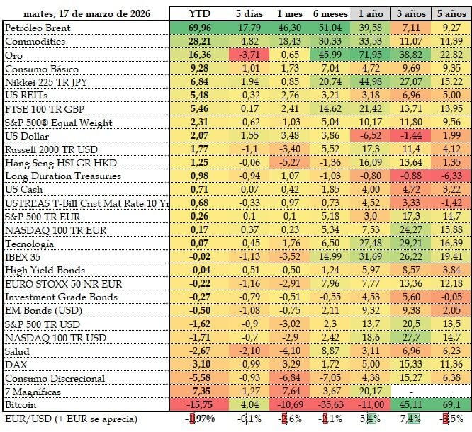 El oro llevaba meses, muchos meses, siendo el activo estrella. Ahora sigue fuerte, pero con la guerra pasan varias cosas. Lo primero es que hay bancos centrales estudiando la posibilidad de financiar su mayor gasto militar con venta de reservas de oro. Lo segundo es que antes primaba el miedo a la moneda fiat, con lo que el refugio era el oro. Ahora el dólar se aprecia y vuelve a ser refugio, porque el temor no es a la moneda sin a la energía. Es decir, que los flujos van a petróleo.