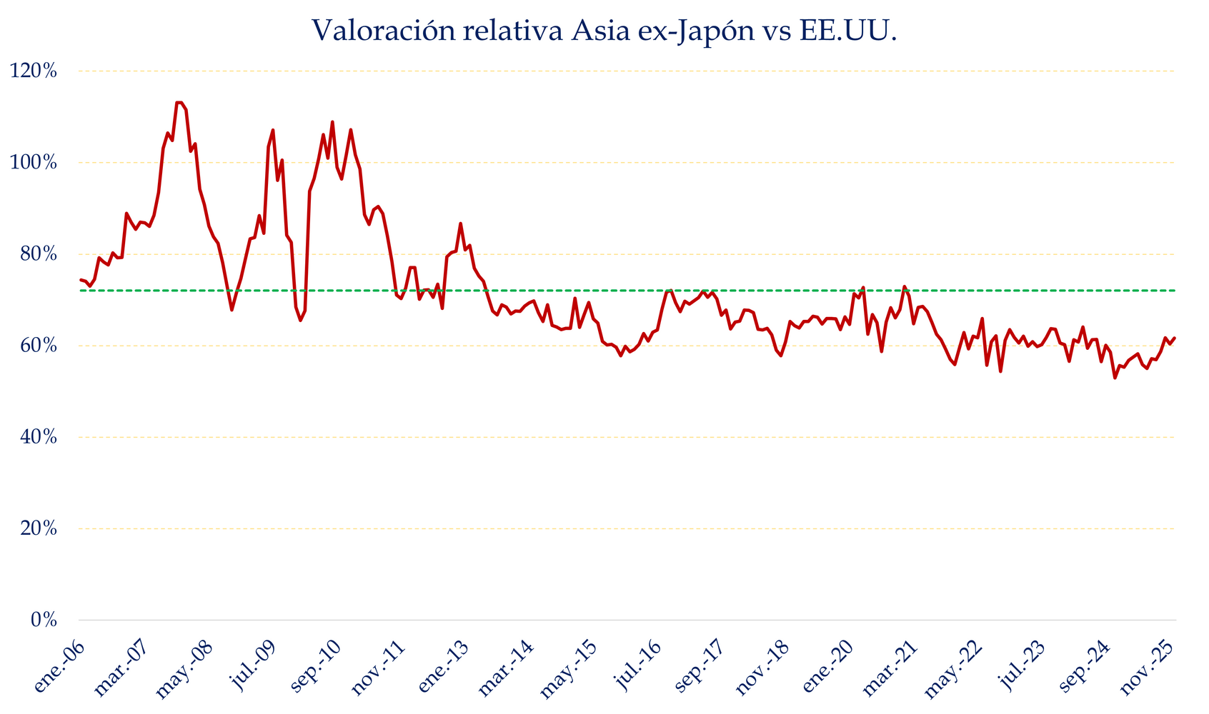 “A pesar de la narrativa común sobre la vulnerabilidad de Asia frente a los aranceles estadounidenses, la evidencia de los últimos años sugiere una dinámica distinta”. En 2025, los países con mayor exposición exportadora, como Corea y China, mostraron comportamientos extraordinariamente positivos (100% y 30% respectivamente en ciertos periodos), superando las expectativas de los bancos de inversión que sugerían refugios en India o el sudeste asiático.