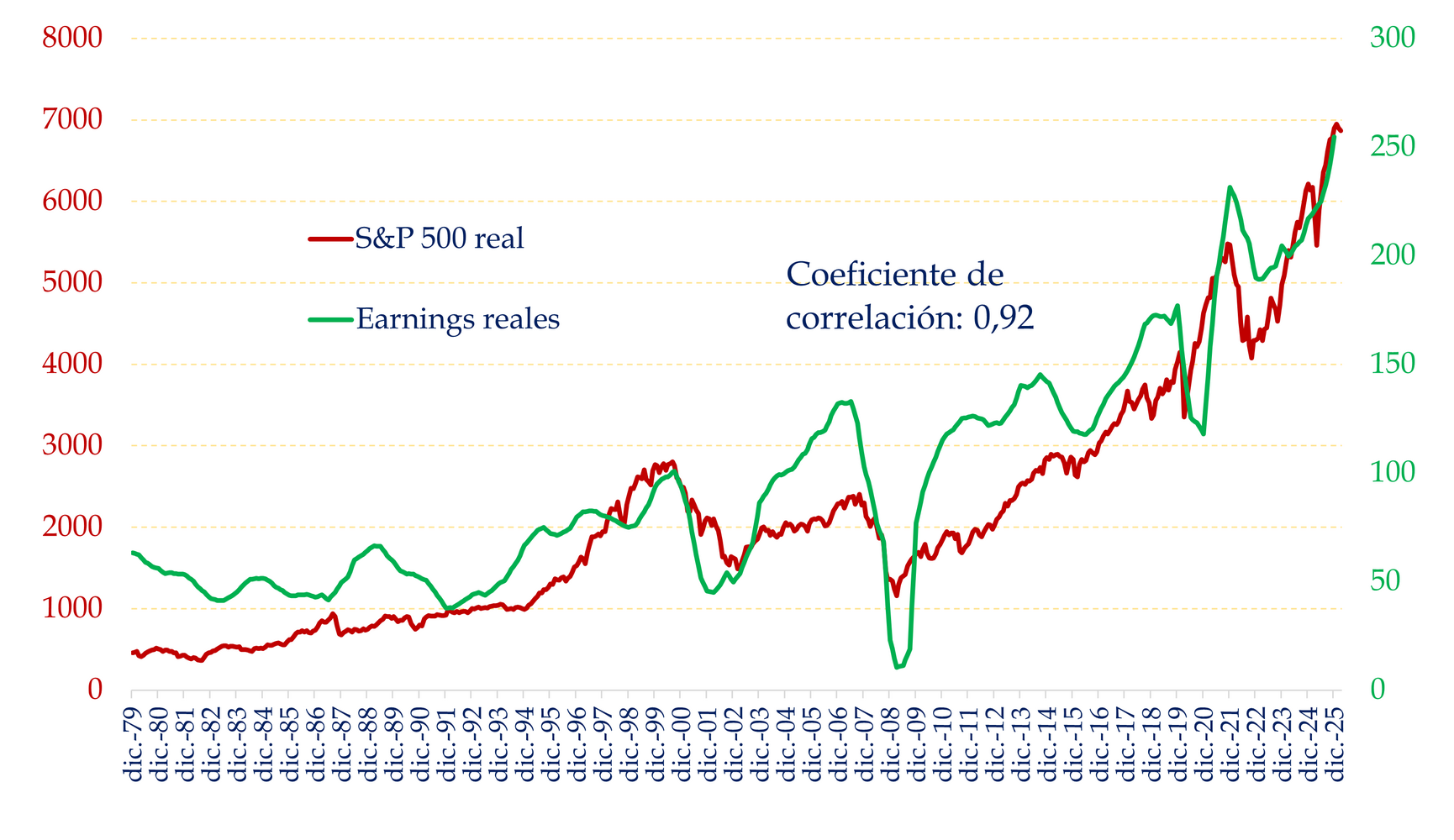 Los beneficios reales vienen creciendo con fuerza. Han sufrido desplomes temporales, especialmente en recesiones, pero la tendencia de fondo ha sido ascendente. Y cuando los beneficios suben de forma sostenida, que también suba la bolsa no es una anomalía. Es, de hecho, lo normal.