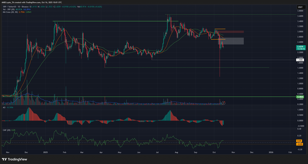 Sin embargo, el sesgo por ahora es bajista. Esto se debe a que los alcistas de XRP habían defendido la zona de demanda de 2.7 a 2.8 dólares de las nuevas pruebas bajistas desde julio, pero la reciente presión de venta obligó al precio a romper por debajo de este soporte.