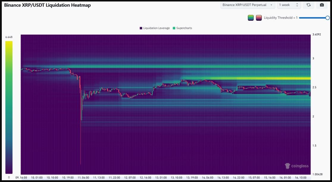 El desequilibrio por debajo de la zona de 2.8 dólares tiene una importancia especial. El mapa de calor de liquidación mostró un conjunto de niveles de liquidación cortos acumulados en 2.67 dólares. Es probable que esta zona magnética impulse a XRP hacia los 2.7 dólares en los próximos días.