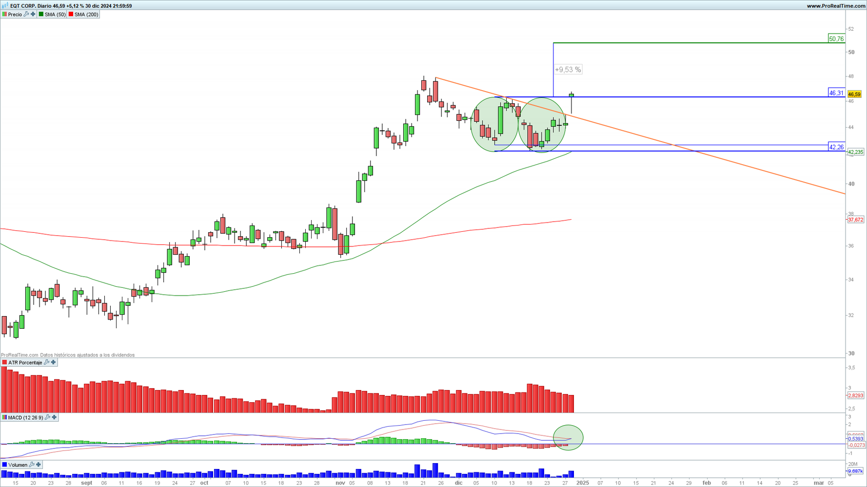 EQT (EQT) en gráfico diario con Rango de amplitud medio en porcentaje (ventana superior) MACD (ventana central) y volumen de negociación (ventana inferior)