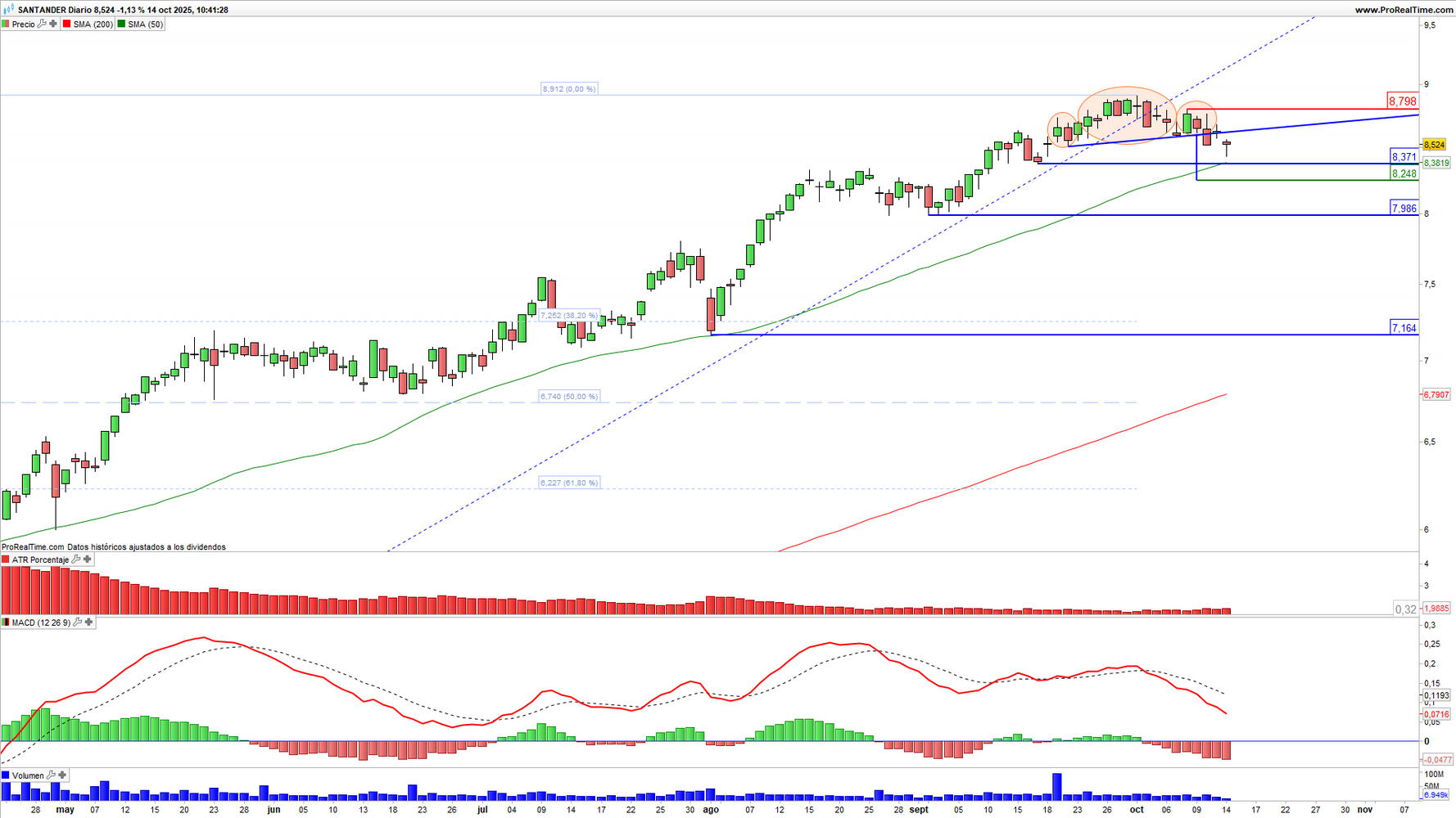 Banco Santander (SAN) en escala diaria con volatilidad (gráfico central superior), MACD (gráfico central inferior) y actividad de contratación (ventana inferior). Fuente: ProRealTime y elaboración propia.