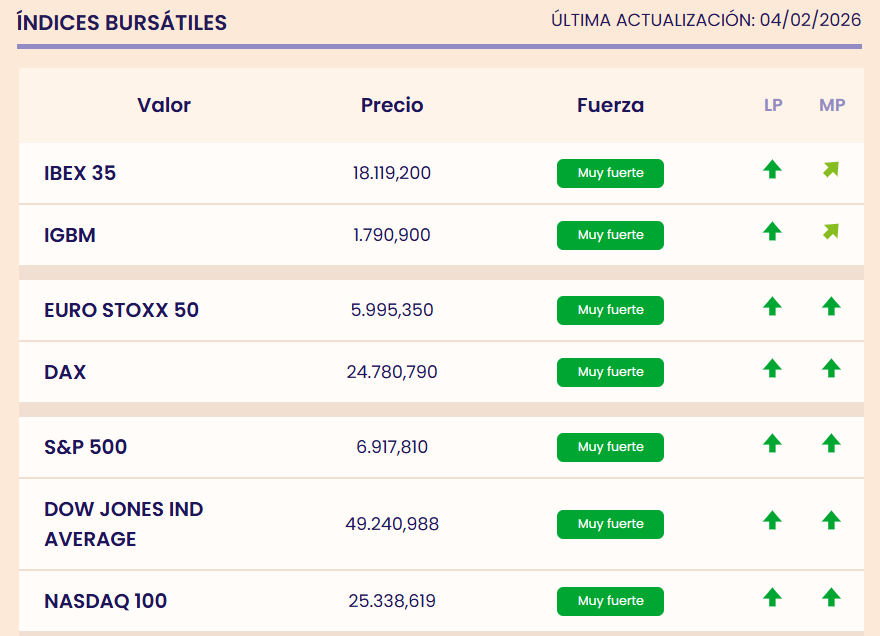 Cualquier inversor particular debe tener alertas para al menos saber cuando su cartera se pone débil o bajista y tiene que salir del mercado. Para eso están los indicadores premium de fuerza y tendencia sobre más de 10.000 valores , índices y materias primas.