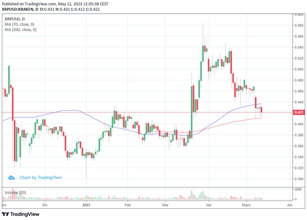 Ripple cotiza en los 0.4289 centavos al mediodía en rojo y las medias móviles de 70 y 200 periodos se encuentran rodeando a las últimas tres velas.