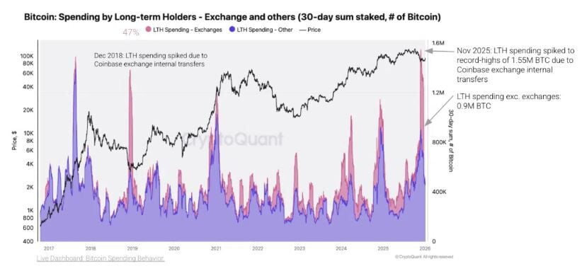 En noviembre de 2025 el gasto en LTH se disparó a 1.55 millones de BTC, debido principalmente a las transferencias internas de Coinbase. No obstante, si se excluyen los exchanges el LTH sigue siendo alto alrededor de 0.9 millones de BTC.