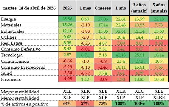 Energía lidera con claridad el comportamiento de 2026, con un avance cercano al +25,9%, muy por encima del resto. Pero a la baja. Detrás aparecen Materiales (+15,3%) y el Industrial. Real Estate (+8,4%) y Utilities (+9,6%), también sorprenden.