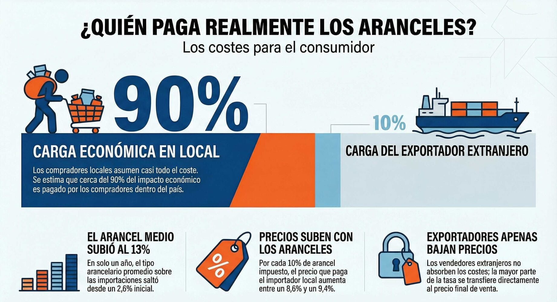 En 2025, el arancel promedio sobre las importaciones de EE.UU. pasó del 2,6% al 13%. Con ese salto, la pregunta correcta es cuánto de ese impuesto se traslada a mayores precios dentro de EE.UU. y cuánto se absorbe por el vendedor extranjero bajando precios.