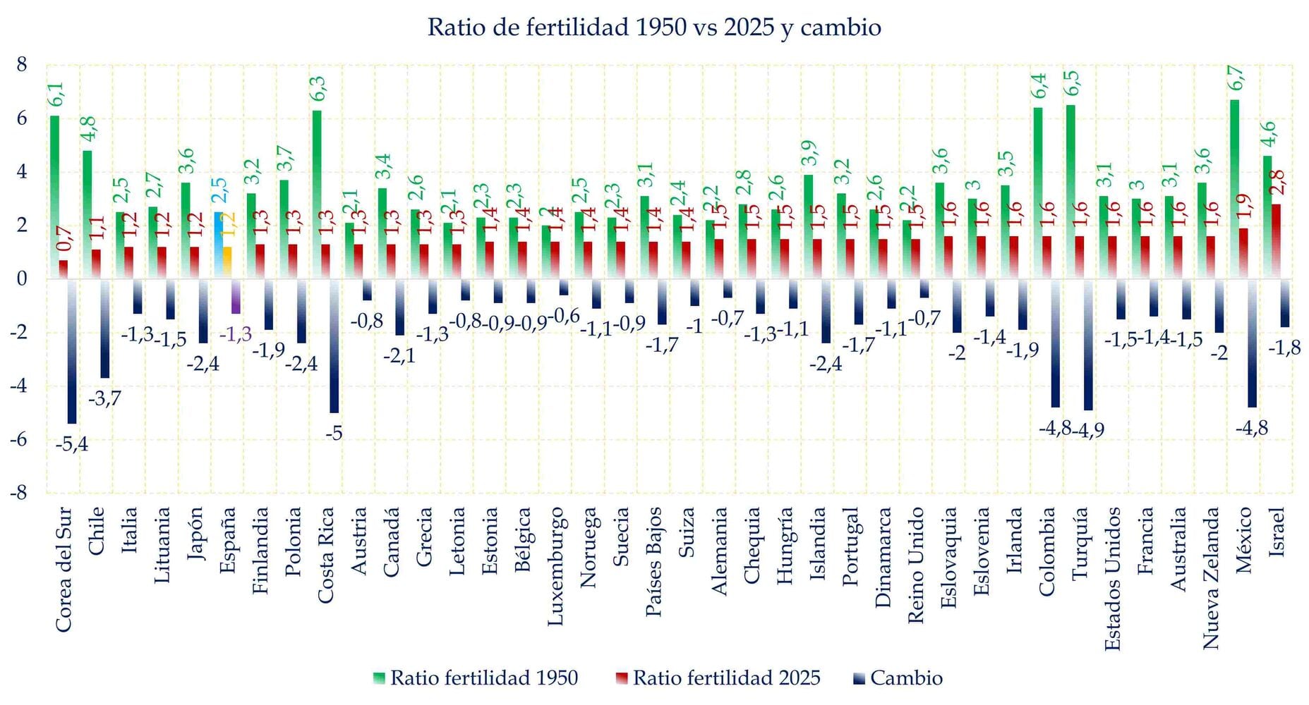 La tasa de fertilidad en nuestro país ha caído de 2,5 hijos por mujer en 1950 a apenas 1,2 en 2025. Para que una población se mantenga estable, el umbral es de 2,1. Por debajo de eso, estamos en terreno de desaparición. Y no estamos solos. Corea del Sur (0,7), Chile (1,1), Japón (1,2), y un largo etcétera. La lista es larga y aglutina a muchísimos países. Lo que era una rareza europea, es ya una tendencia mundial.