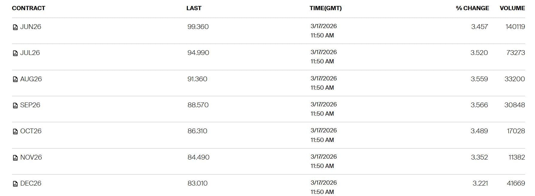 Subida del crudo que se mantiene inalterado por encima de la peligrosa cota de los 100 dólares para los futuros y que se colocan ligeramente por debajo de esa cota, en los 99,21 para el mes de junio, para solo quebrar su precio por debajo de los 90 para después del verano.
