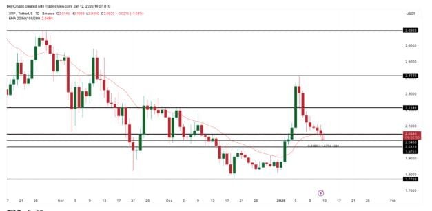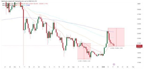 La ola de ventas se aceleró después de que XRP no lograra recuperar su EMA de 200 días en el pico del 6 de enero. Una EMA, o media móvil exponencial, otorga mayor peso a los precios recientes y se utiliza a menudo para evaluar la fuerza de la tendencia a corto y largo plazo. Cuando el precio se mantiene por debajo de las EMA clave, los vendedores suelen mantener el control.