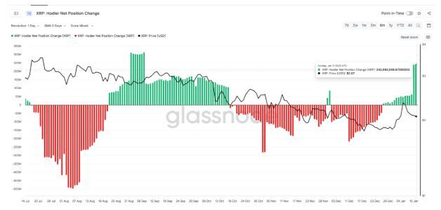 El 10 y el 11 de enero, los tenedores absorbieron alrededor de 239 millones de XRP y 243 millones de XRP, incluso mientras el precio seguía cayendo. Esto convierte a esta en la racha de compras en caídas de dos días más fuerte desde el 7 de septiembre.