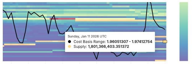 El segundo se sitúa entre 1.96 y 1.97 dólares, con otros 1.8 mil millones de XRP comprados. Estos niveles explican por qué la presión de venta se ha ralentizado a pesar del débil impulso.