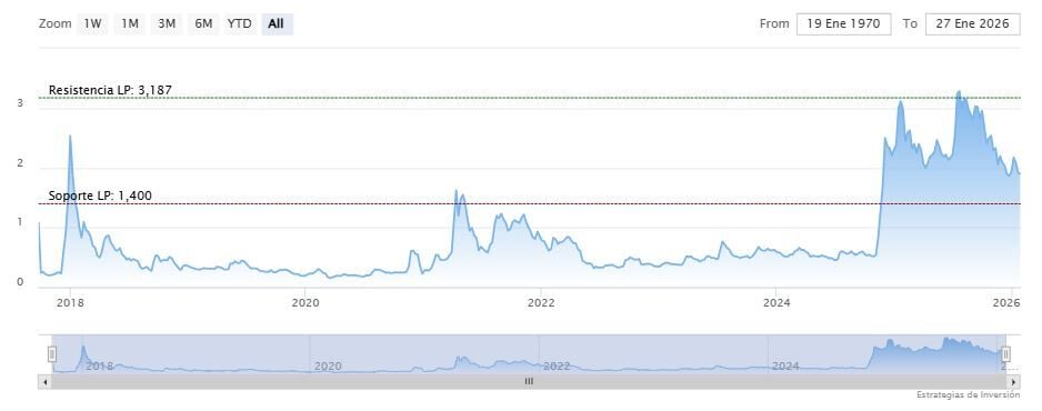 La resistencia a mediano plazo se encuentra en los 2.58 dólares. Mientras, los indicadores de Ei se muestran mixtos.