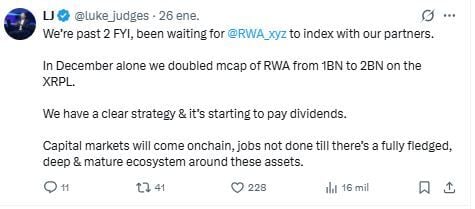 El cryptoanalista Luke Judges ha señalado en X que Ripple Ledger (XRPL) ha superado los 2 mil millones de dólares en activos tokenizados en respuestaal inversor criptográfico Paul Barron. Gestionando más del doble de lo que se pensaba inicialmente, según Harvey Hunter en Crypto News.