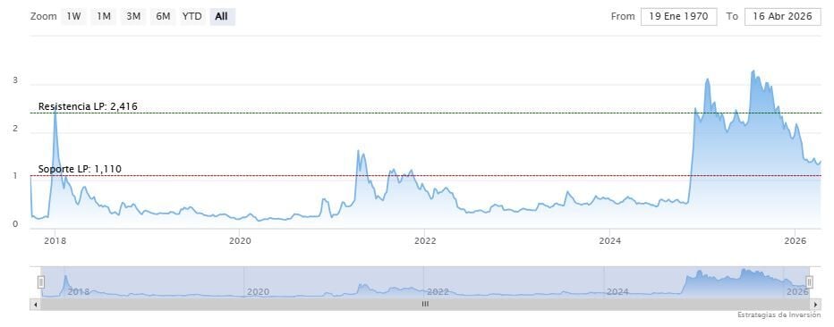 La resistencia a mediano plazo se encuentra en los 1.67 dólares. Mientras, los indicadores de Ei se muestran mixtos.