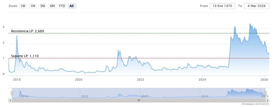 Si los alcistas logran impulsar este rebote, Carter ha definido una serie de ambiciosos objetivos de precio. La recuperación inicial probablemente apuntaría a 1.50 y 1.80 dólares, y una ruptura exitosa de estos niveles abriría la puerta a un ascenso hacia 2.35 y 2.70 dólares. En una extensión alcista completa, el análisis apunta a objetivos macro en 3.10 y 3.55 dólares.