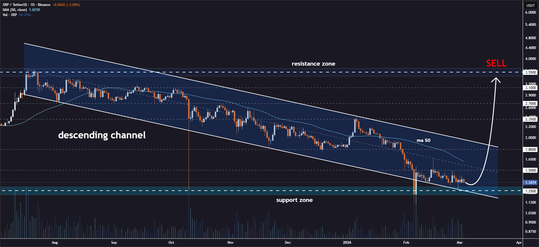 La condición principal para una transición alcista es un cierre de vela semanal por encima de la EMA de 200 y la resistencia horizontal de 1.55 dólares. Lograr esto indicaría un aumento repentino de la fortaleza a corto plazo y un cambio significativo en el impulso del mercado. A pesar de este impulso, XRP permanece confinado dentro de un canal descendente a largo plazo, lo que sugiere que la estructura macroeconómica general sigue siendo técnicamente correctiva.