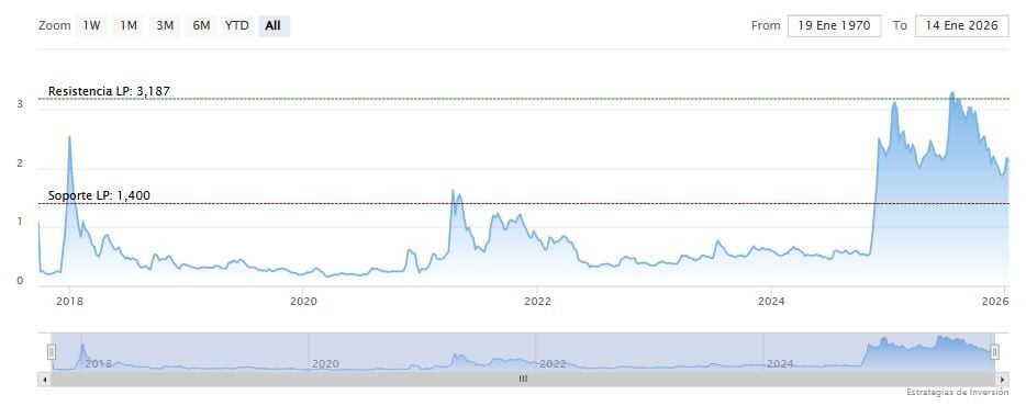 La resistencia a mediano plazo se encuentra en los 2.58 dólares. Mientras, los indicadores de Ei se muestran prácticamente alcistas.