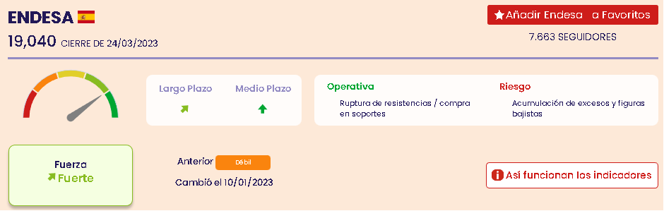 Gracias a nuestros indicadores de fuerza de Estrategias de Inversión, (ver indicadores) podemos obtener un análisis cuantitativo de cualquier valor, representado de una manera clara, rápida y sencilla. Tanto en Endesa, como en Gestamp, están actualmente catalogados como “fuertes” pudiendo ofrecer una oportunidad de entrada en rupturas de resistencia, tal y como veremos a continuación.