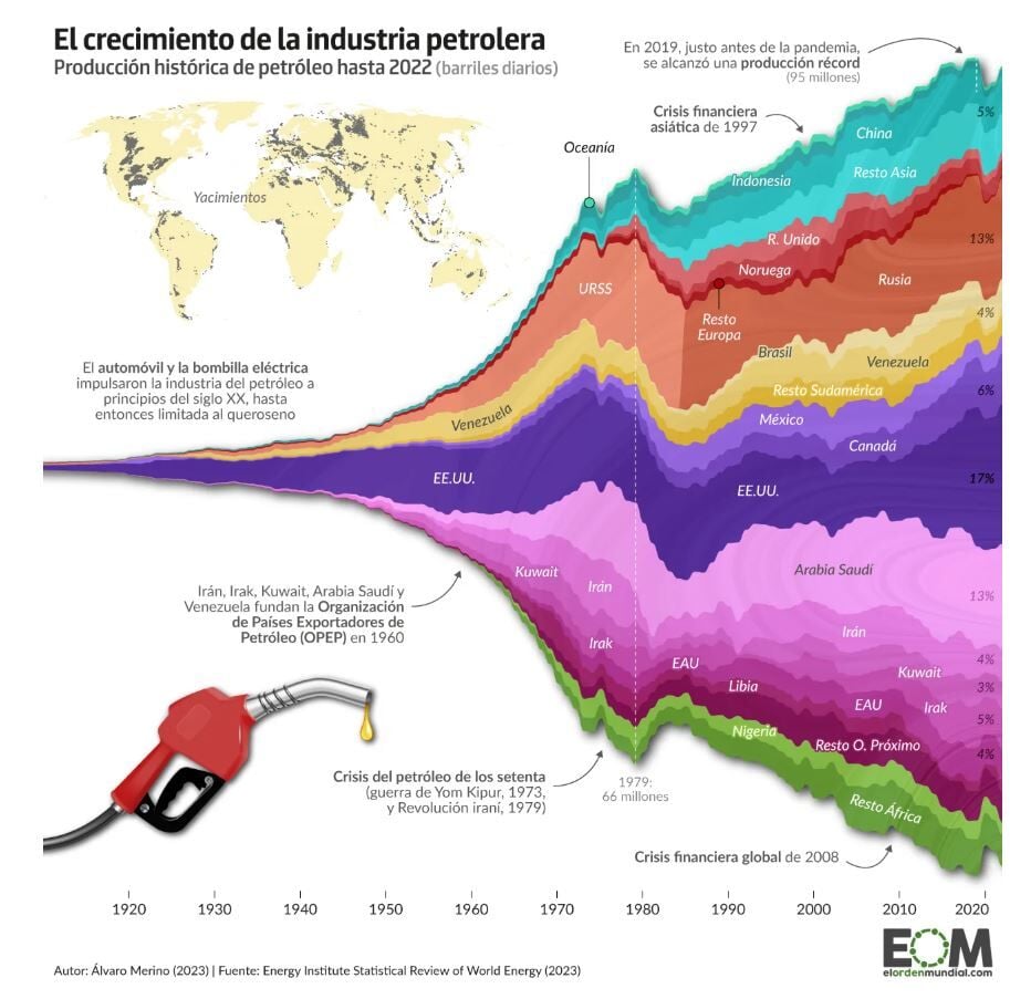 El petróleo ha sido un recurso clave para la globalización y el desarrollo económico, pero su impacto medioambiental ha promovido un cambio hacia un modelo más sostenible. Por ello, las medidas para frenar el cambio climático fomentan el abandono del crudo y la producción de nuevas energías renovables. Así, la sociedad irá reduciendo de forma gradual su demanda de combustibles fósiles. Sin embargo, mientras la economía mundial siga dependiendo del petróleo, los países productores seguirán en una posición privilegiada.