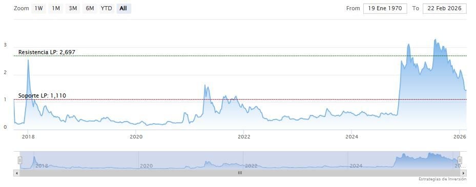 La resistencia a mediano plazo se encuentra en los 2.41 dólares. Mientras, los indicadores de Ei se muestran mixtos.