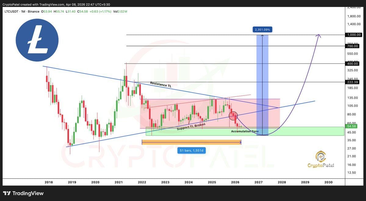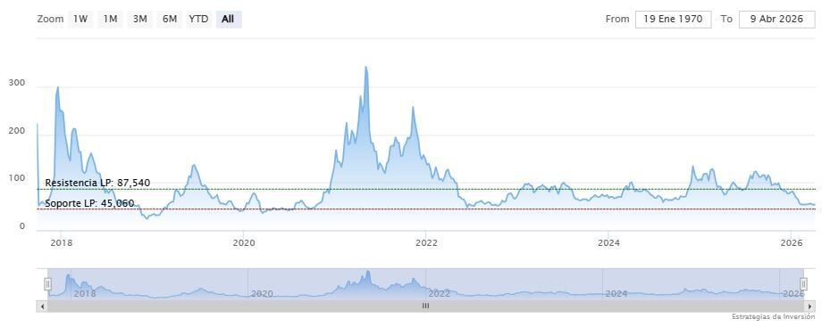 Desde un punto de vista técnico, Litecoin está intentando recuperarse. Tras caer a alrededor de 51.80 dólares a principios de abril, el precio ha empezado a formar mínimos crecientes, actualmente en torno a los 54 dólares. Este suele ser uno de los primeros indicios de recuperación.