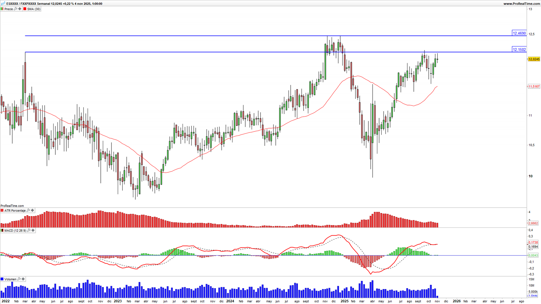 Diferencial entre el índice S&P 500 y el índice Stoxx 600 en escala semanal con volatilidad (ventana central superior), MACD (ventana central inferior) y volumen de contratación (ventana inferior). Fuente: ProRealTime y elaboración propia.
