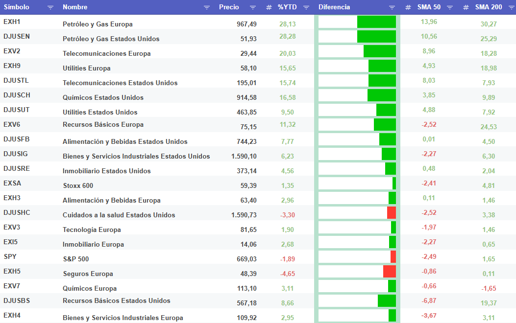 Por tanto, en esta pieza vamos a establecer un análisis detallado de los principales sectores de Europa y Estados Unidos atendiendo a la distancia a la que se encuentran los mismos de la media móvil de 50 sesiones y de 200 sesiones con la finalidad de determinar cuáles son los sectores que están presentando un comportamiento superior al Índice Euro Stoxx 600 y al Índice S&P 500 y, por consiguiente, qué sectores están presentando fortaleza en medio del clima de incertidumbre geopolítica que se registra en las últimas semanas.